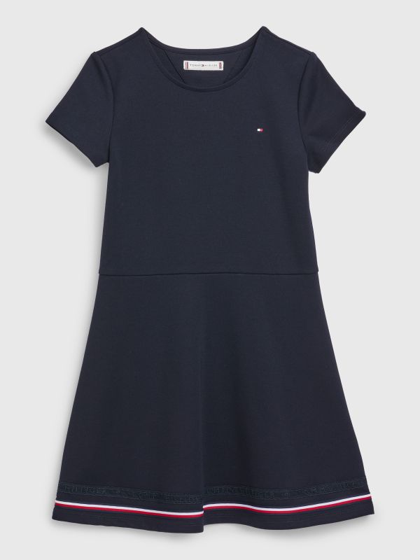 يضيف تطريز الشعار المعدني على الحافة لمسة مرحة على الفستان المطاطي الذي يميز بتصميم تنورة واسعة.