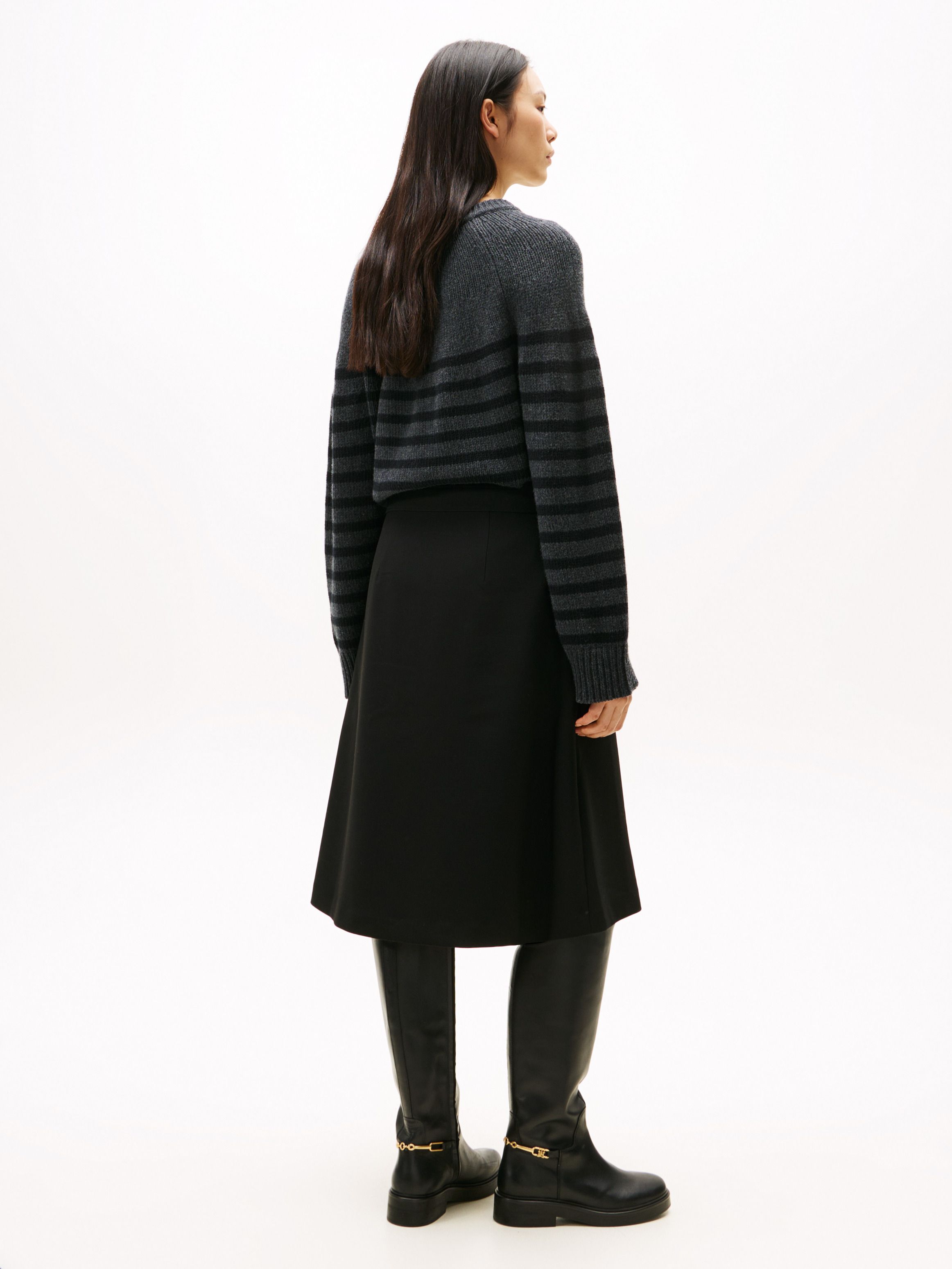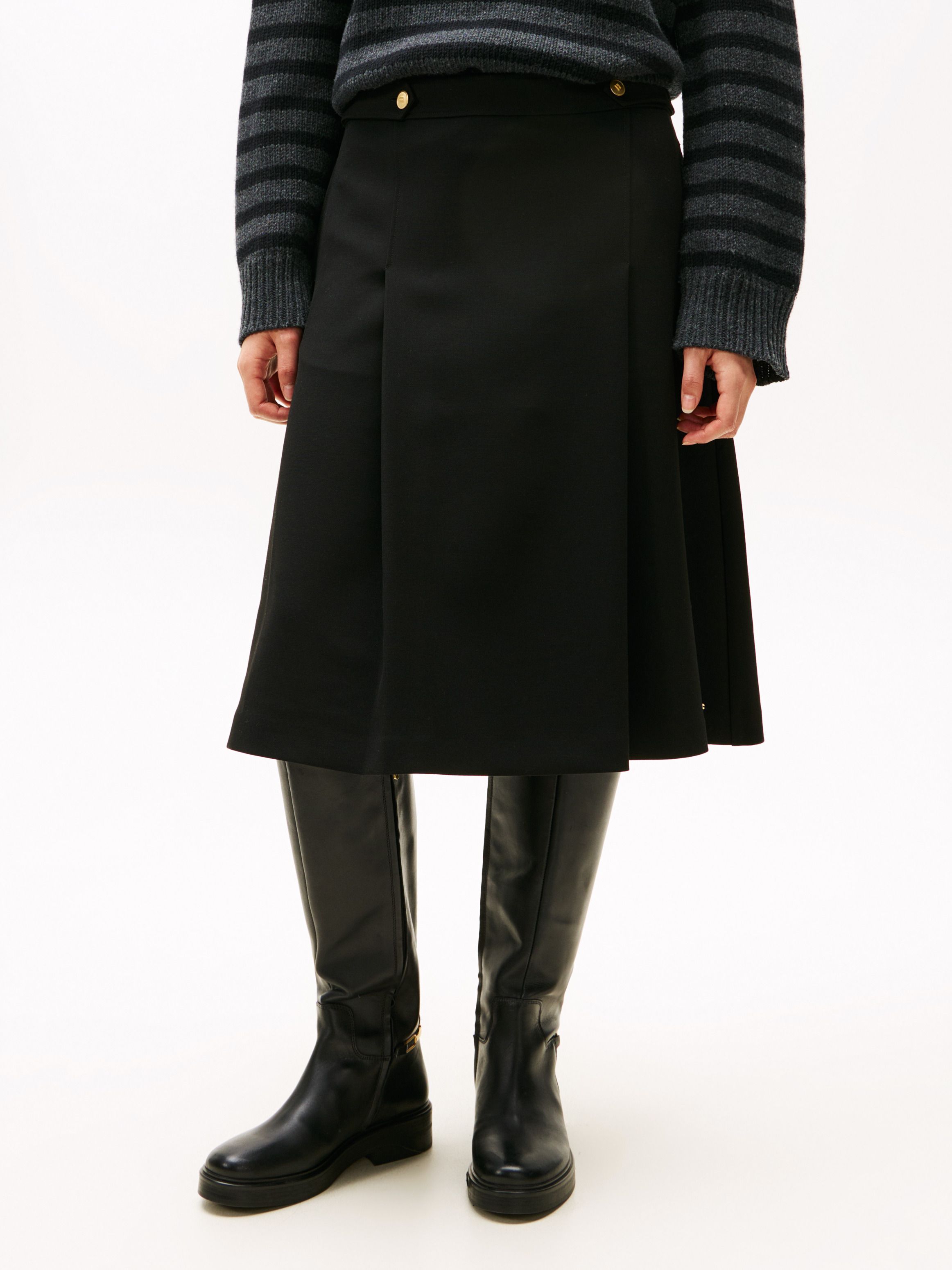 التفاصيل أضيفي لمسة فاخرة إلى إطلالتك العملية مع هذه التنورة الميدي الخفيفة المزينة بأزرار ذهبية، التي تأتي بقصّة A واسعة تبرز جمال القوام، وتفصيل الطيات الأمامية الأنيقة لمظهر أنثوي ومرتب. أبرز التفاصيل • مزيج فيسكوز مطاطي • قماش خفيف الوزن • طيّة أمامية أنيقة • أزرار بلون ذهبي أنيق • شعار تومي هيلفيغر • نقش شعار العلم على الأزرار • علم تومي هيلفيغر المعدني على الحاشية القصة والمقاس • قصة عادية • بطول ميدي • تصميم بقصّة A • طول العارضة 1.76 م وتلبس مقاس 8 • الطول من الخصر إلى الحاشية: 67 سم (لمقاس 8) الخامة والعناية • 68% بوليستر، 28% فيسكوز، 4% إيلاستين