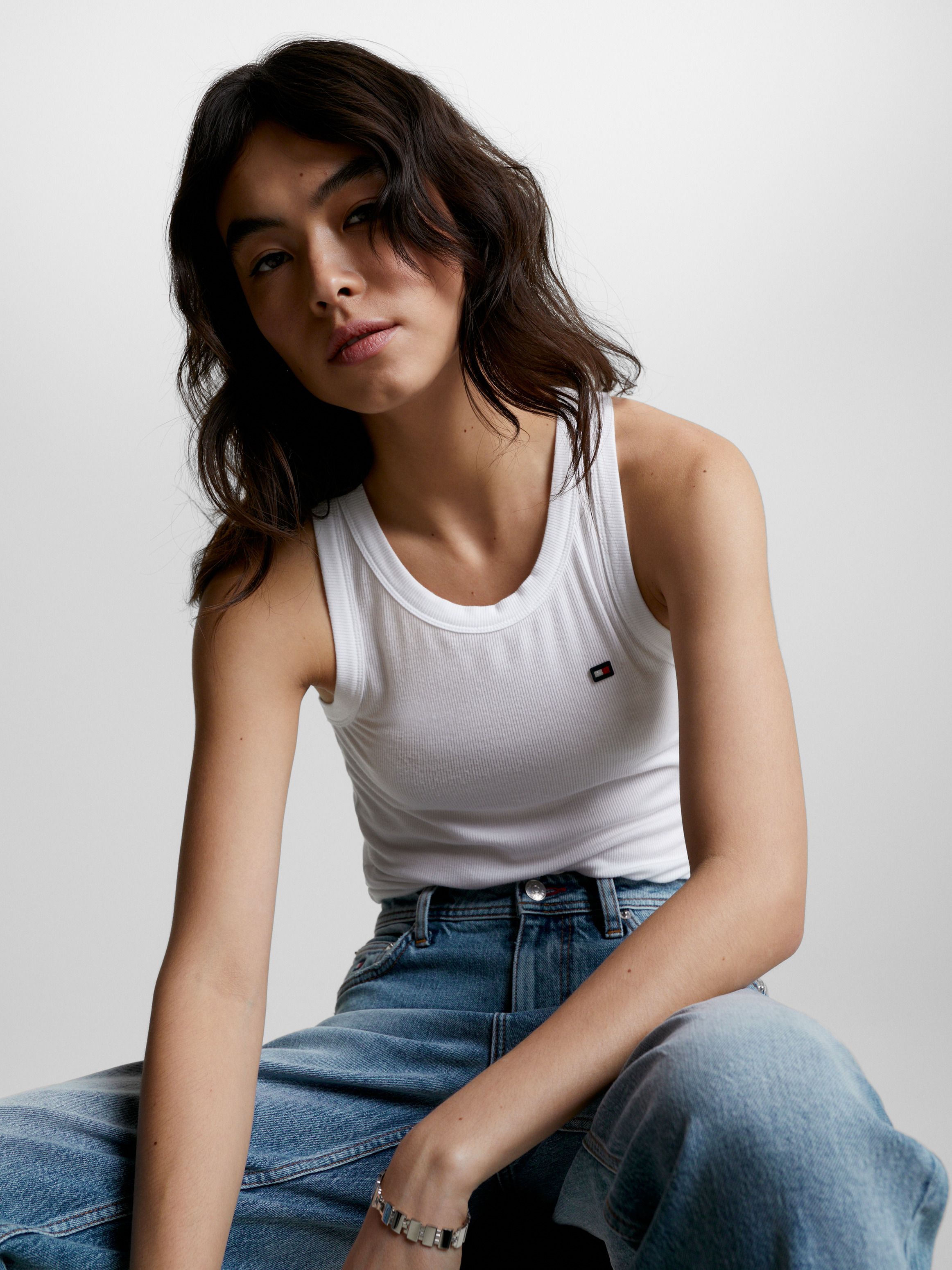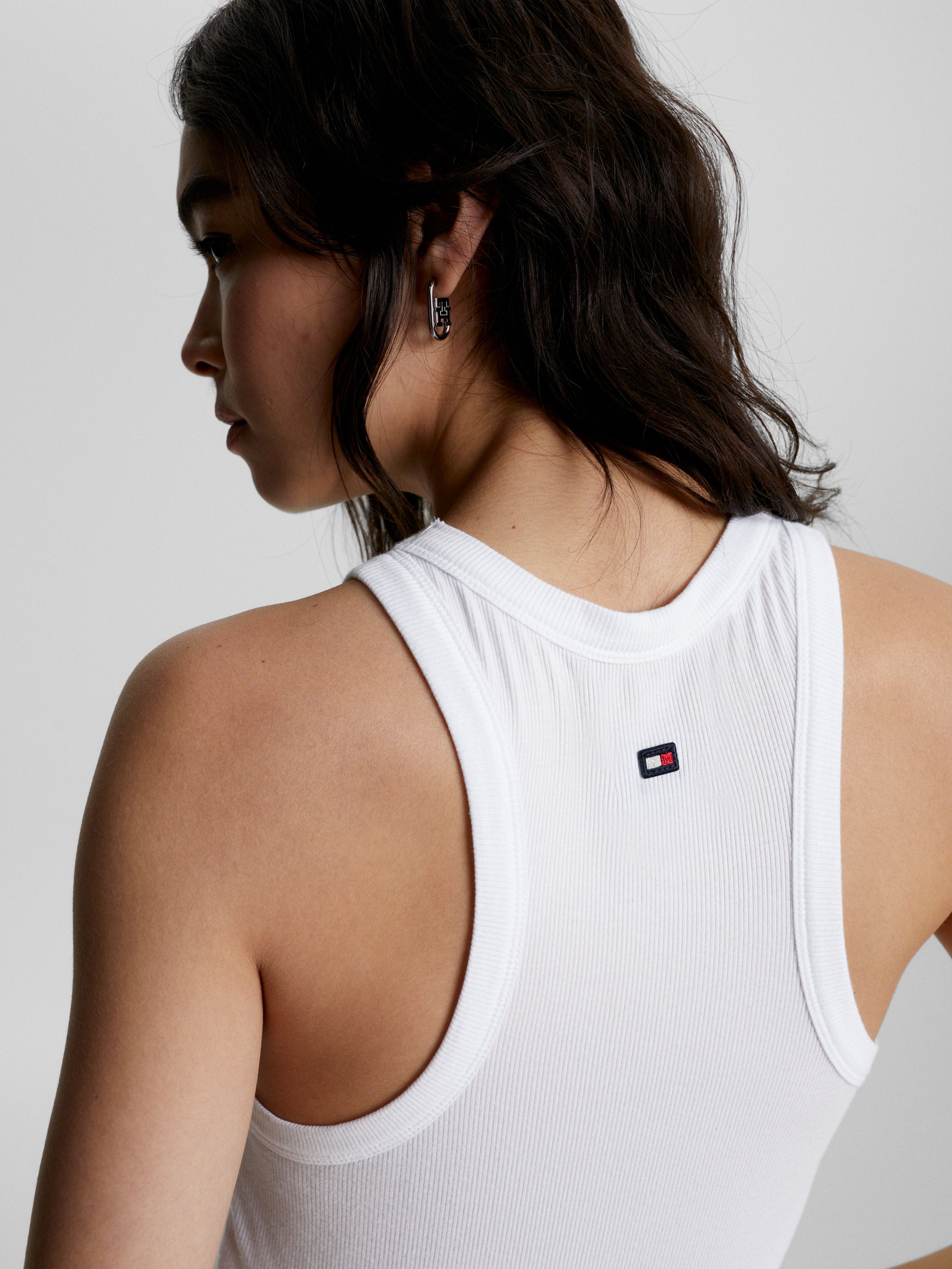 احصلي على تانك توب ضيق مصنوع من المودال المستدام، كما يتميز بياقة سكوب وتفاصيل العلامة التجارية.