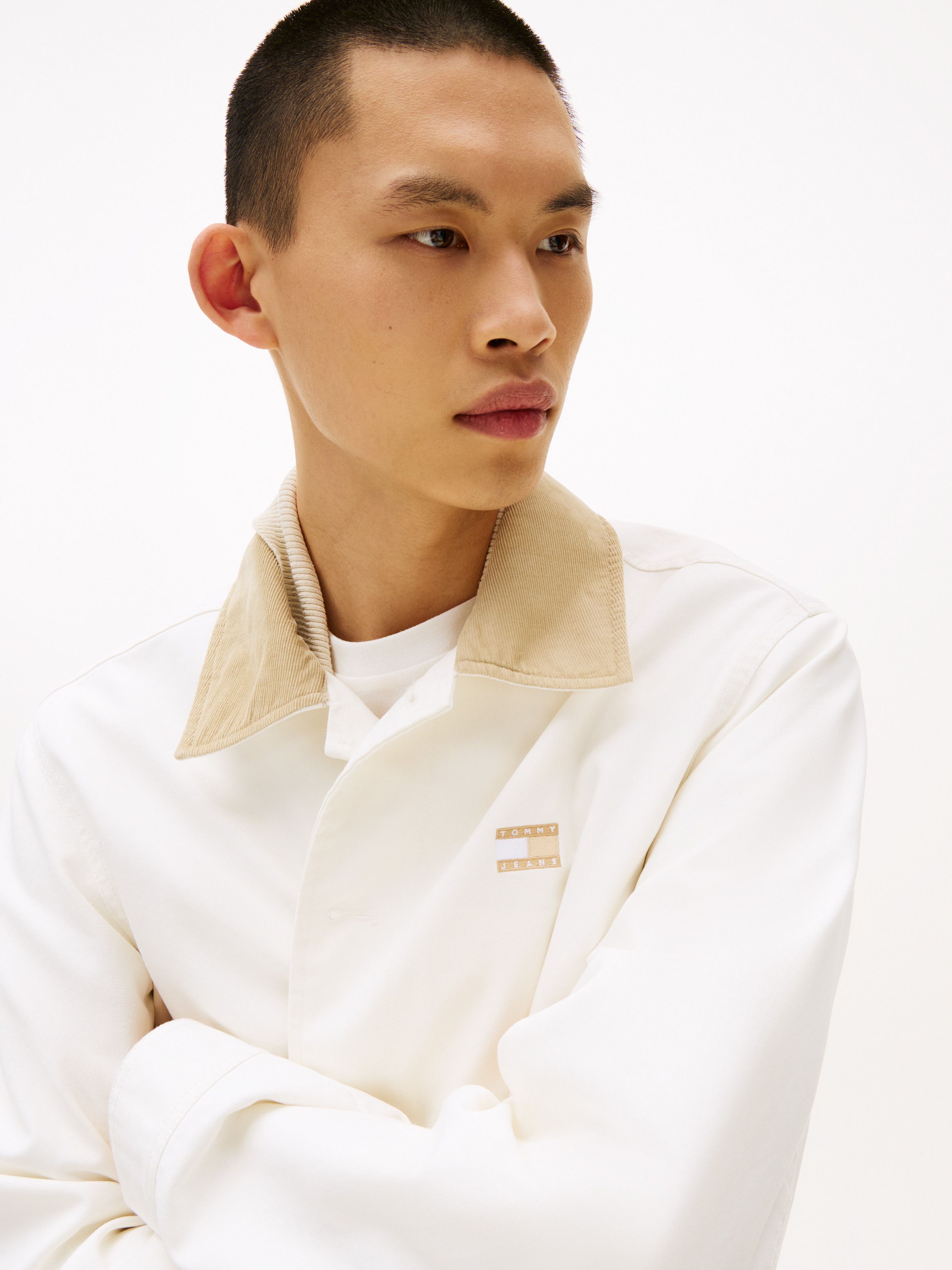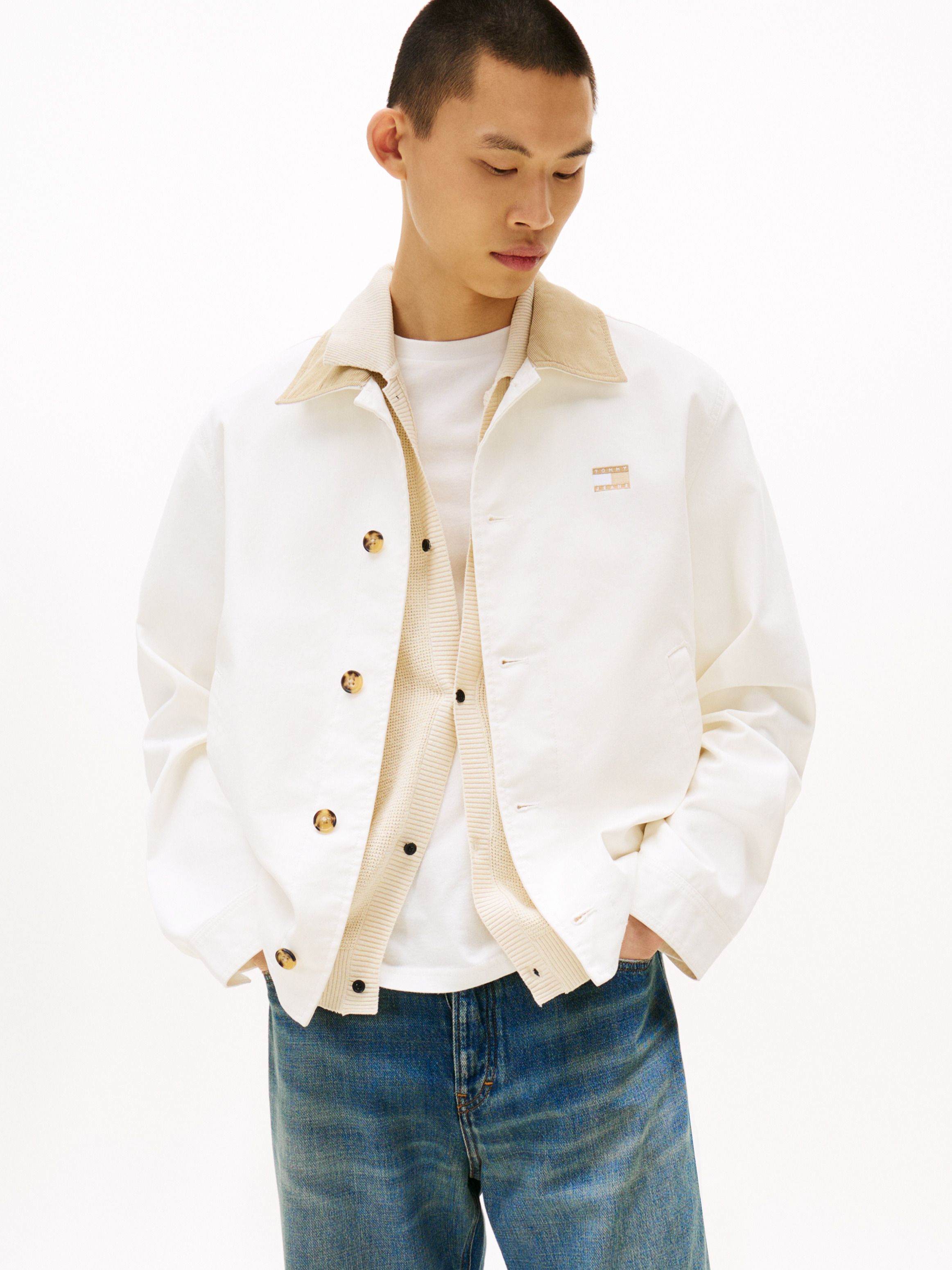 جاكيت مستوحى من ملابس العمل، مصنوع من نسيج مريح من مزيج القطن ويأتي بياقة كوردروي لمظهر عملي وأصيل.